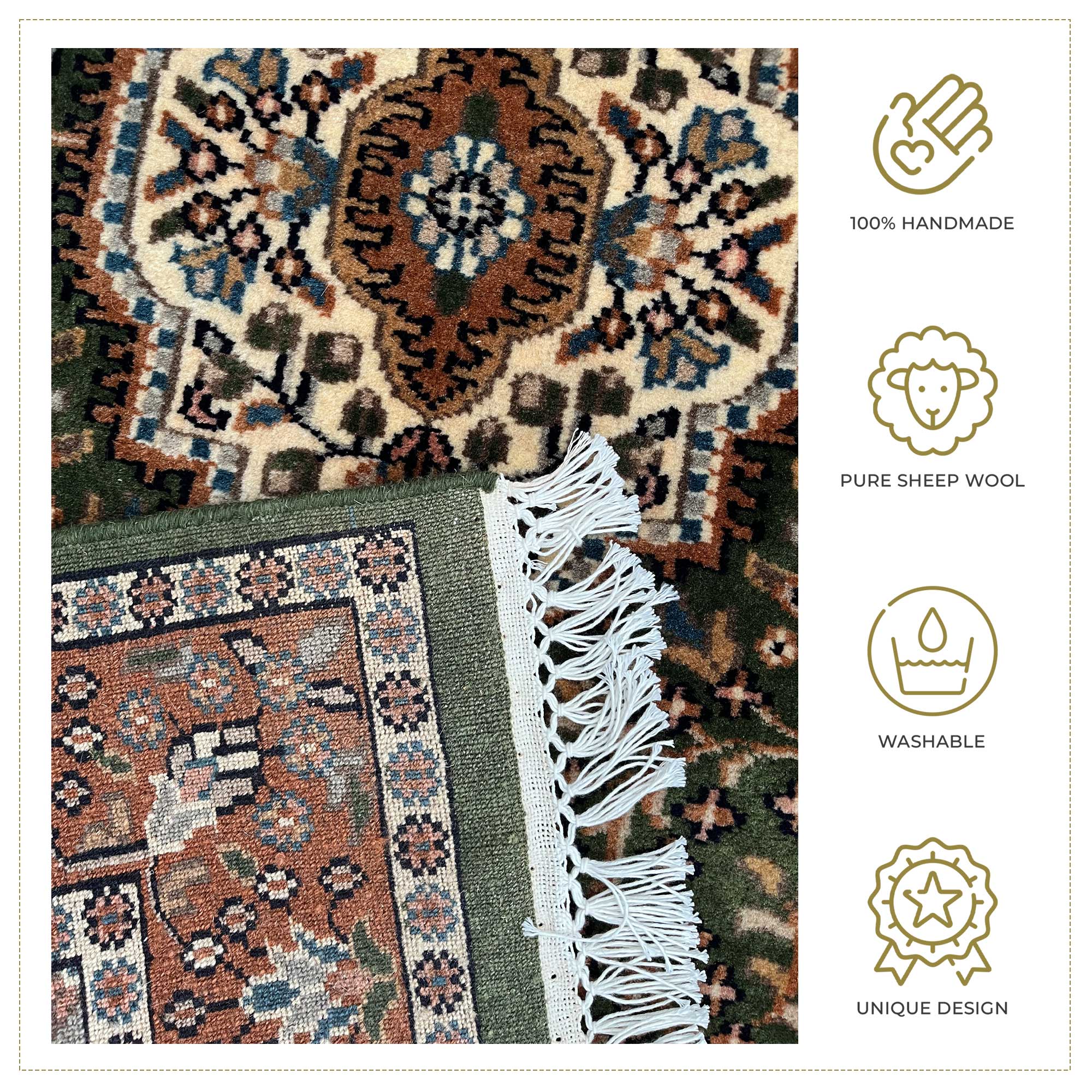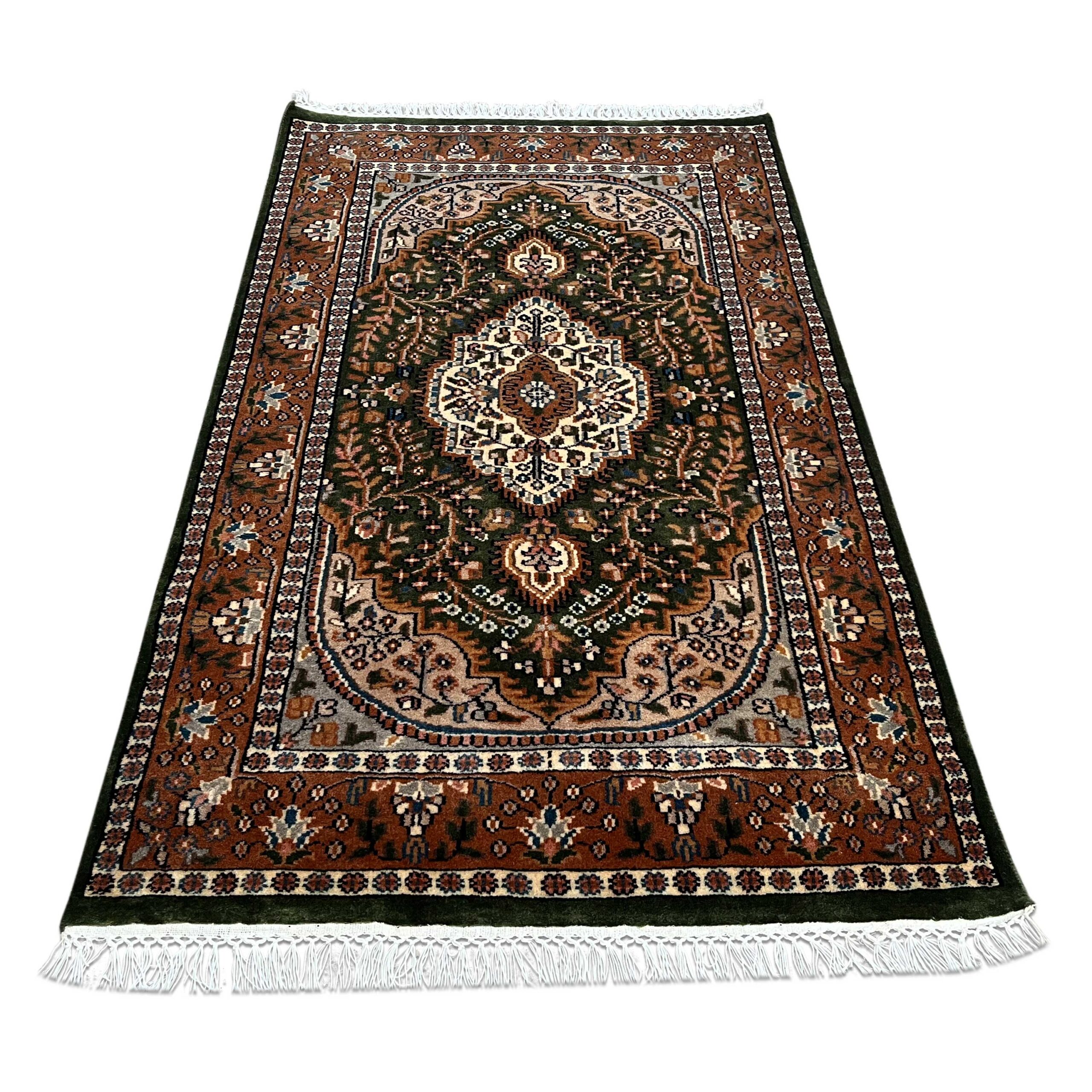A beautiful harmony of tradition and elegance, this 3×5 feet hand-knotted green Indo-Persian rug is woven meticulously by rural artisans using premium pure wool. The soothing green tone symbolizes prosperity and peace, making it suitable for living rooms, study rooms, and calm home corners. The Indo-Persian motifs are crafted with precision, giving the rug a royal and vintage aesthetic. Its thick, durable wool ensures comfort, warmth, and strength?making it a timeless family treasure that can be passed down for generations.