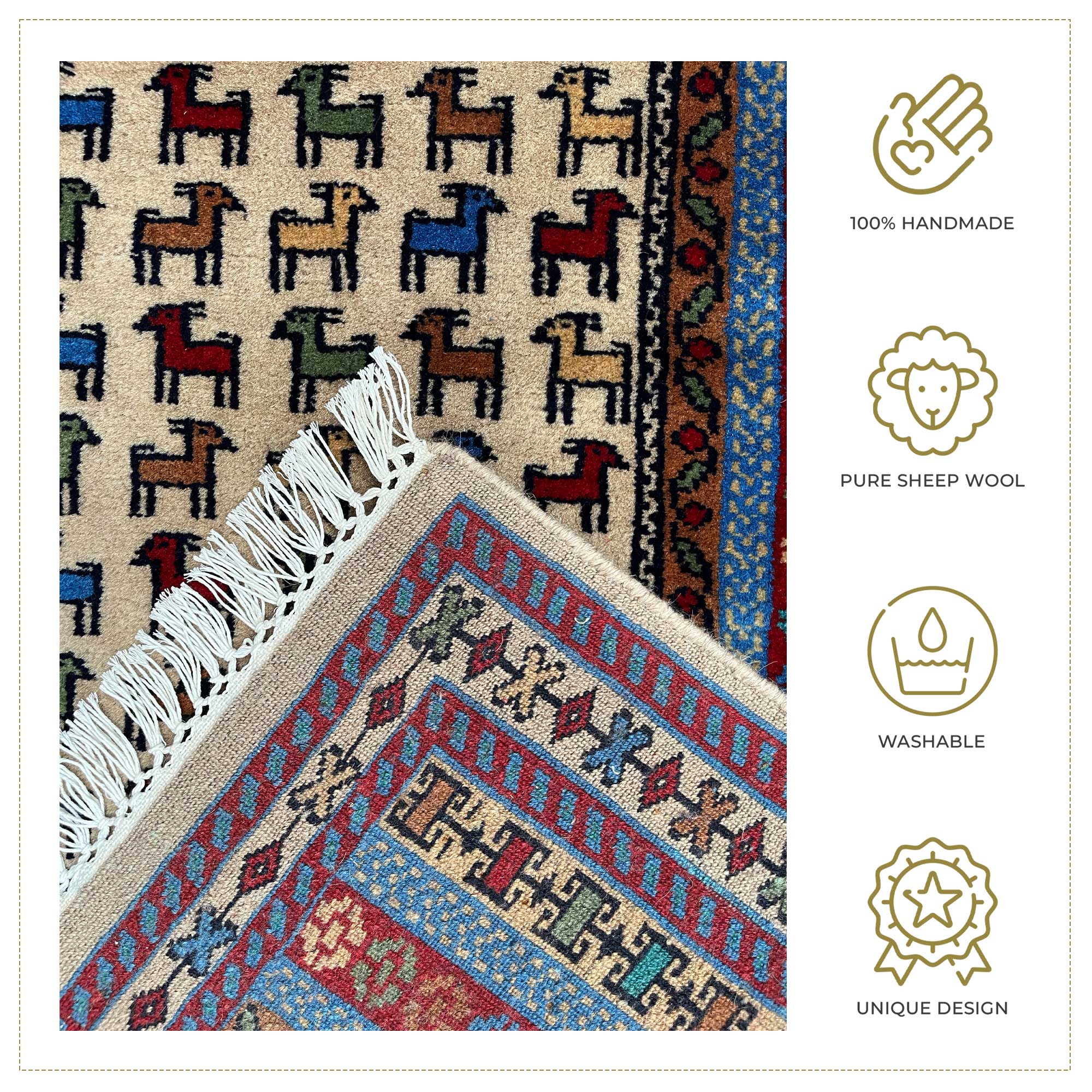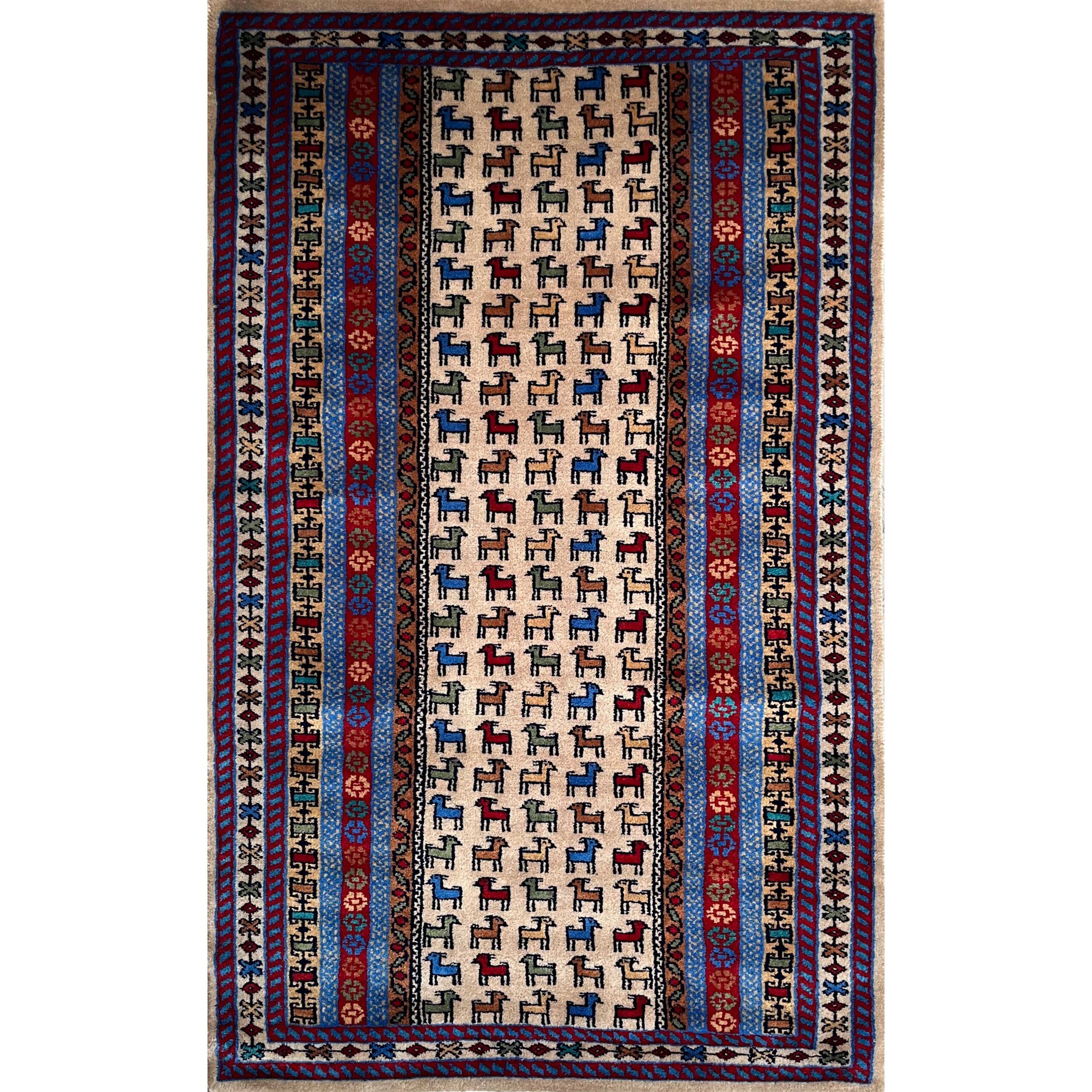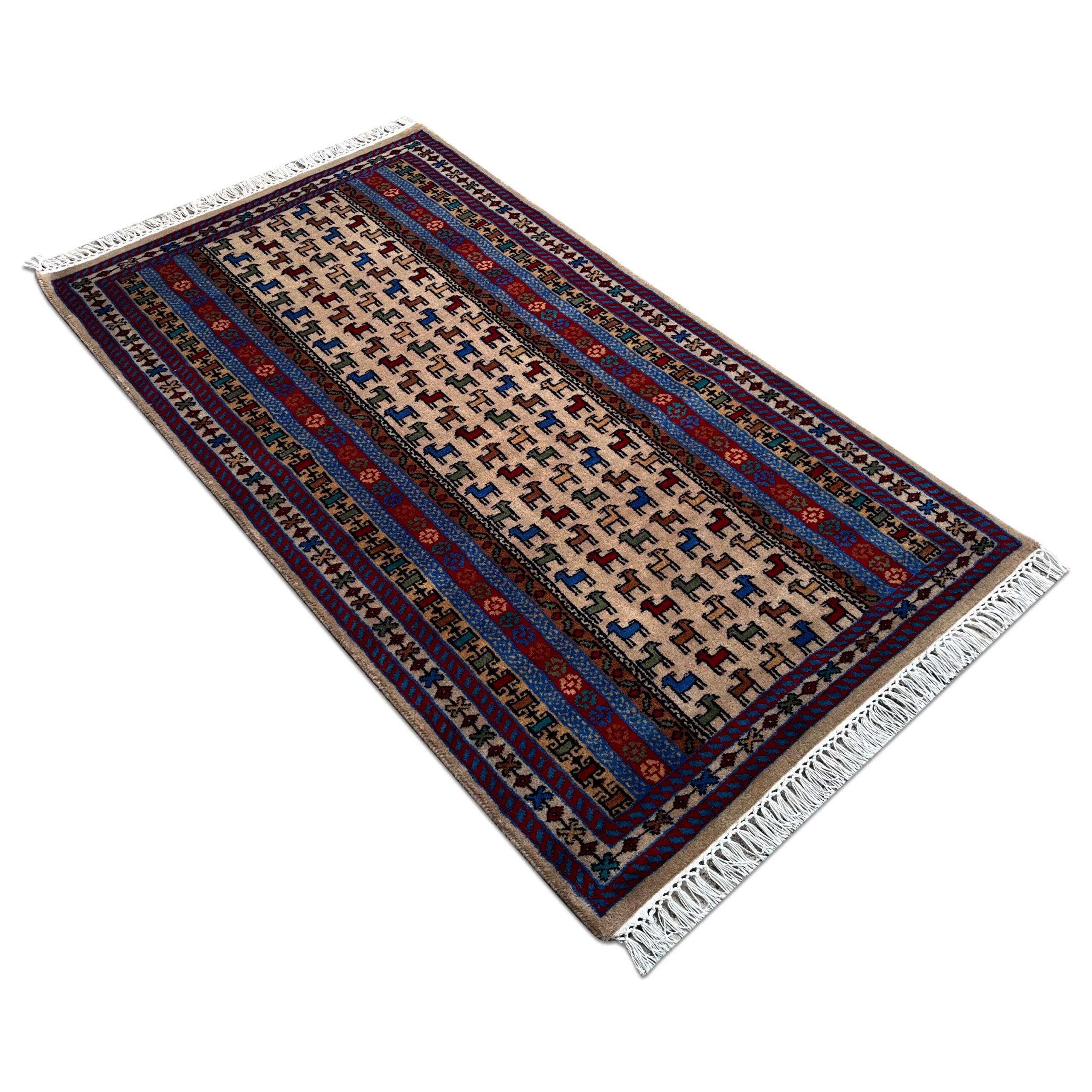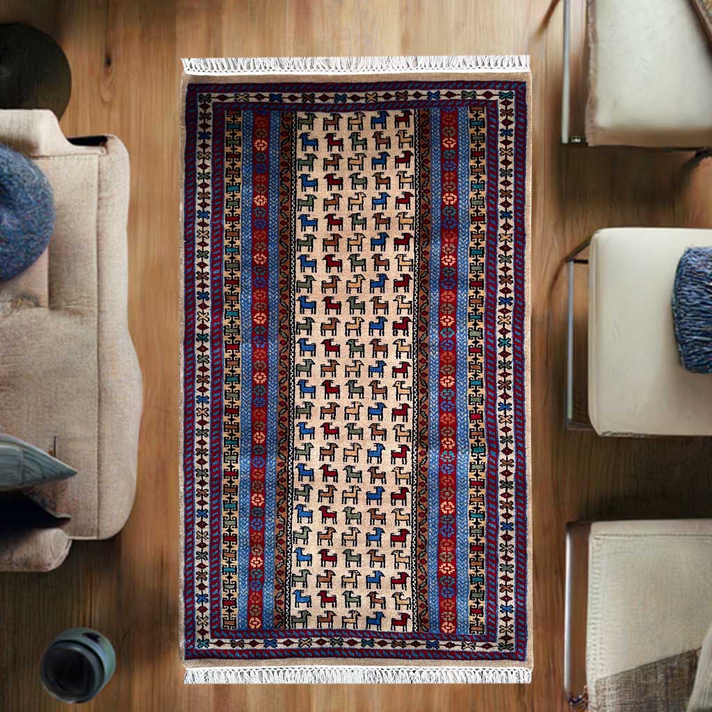 This 3×5 ft handmade wool carpet features a beautiful Beige Bakri design. Expertly woven with pure wool, it adds warmth and a natural touch to any space. Perfect for living rooms, bedrooms, or study areas, it combines traditional craftsmanship with a modern aesthetic.