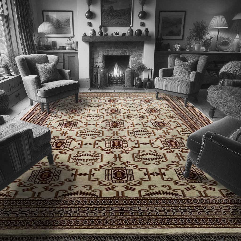 Inspired by royal palace interiors, this 6×9 feet white Palace design rug represents luxury in its purest form. Hand-knotted using fine-quality wool, it offers a soft, elegant texture and a timeless royal aesthetic. The intricate palace-style pattern makes it perfect for premium homes, suites, halls, and high-end interior settings. With its refined craftsmanship and classic appeal, this rug transforms any space into a sophisticated, graceful environment.