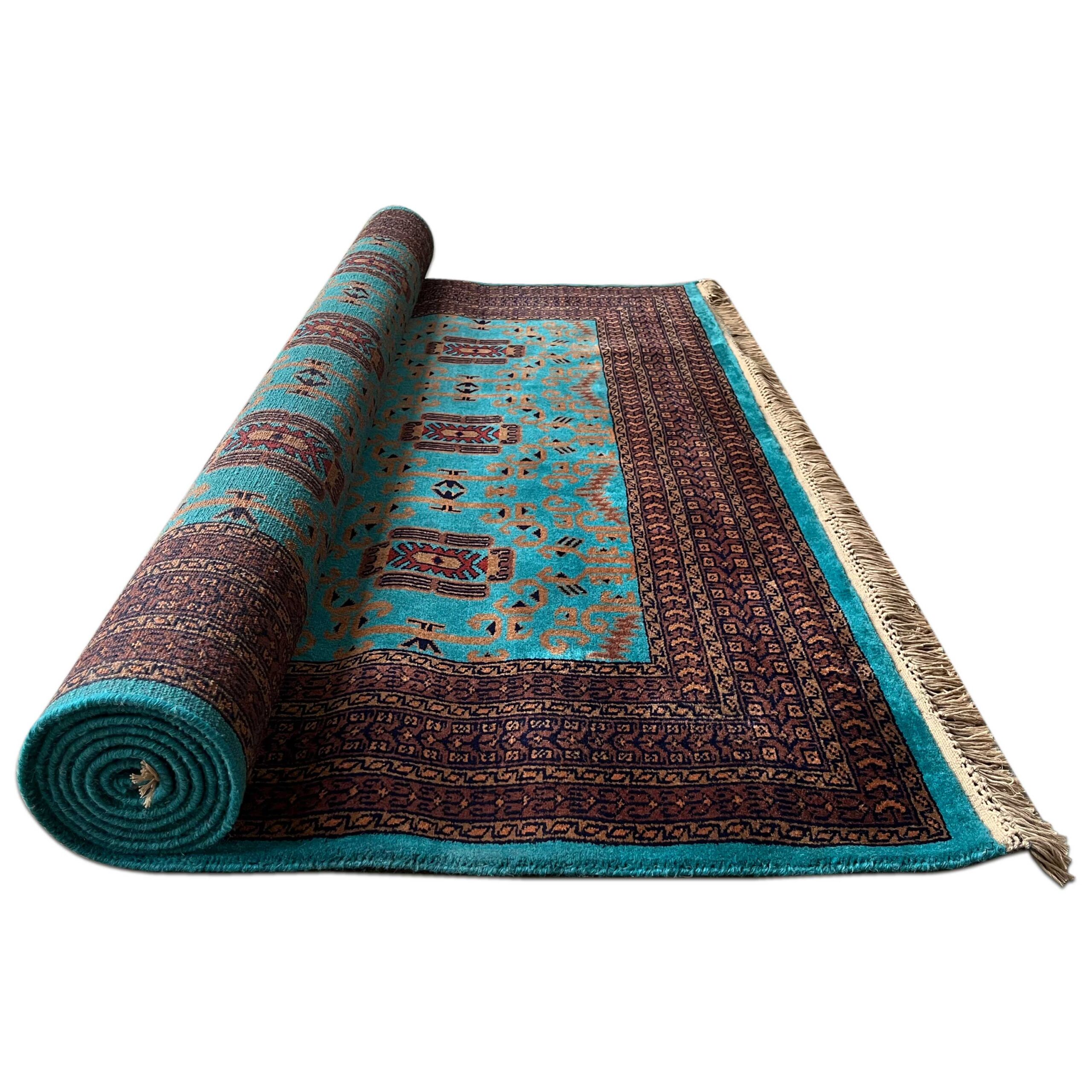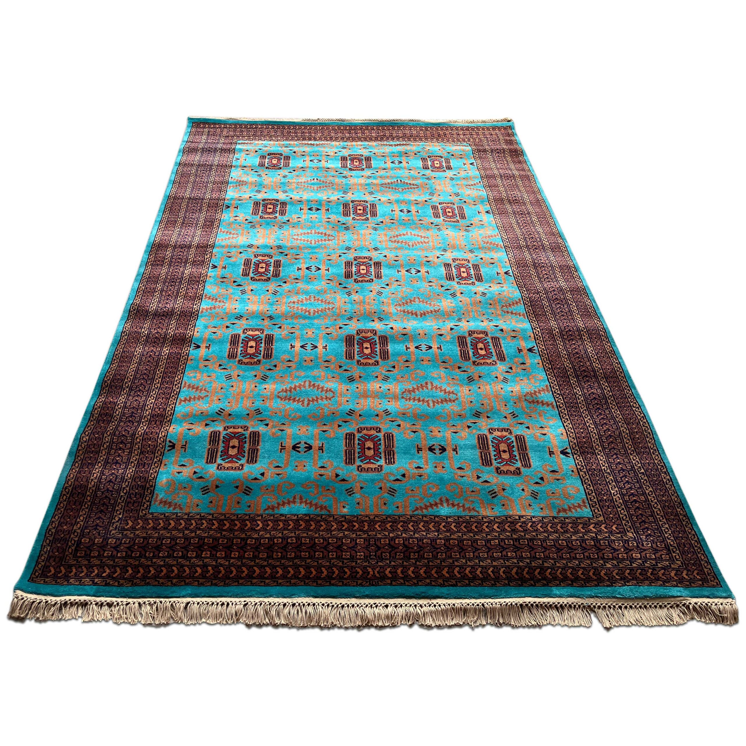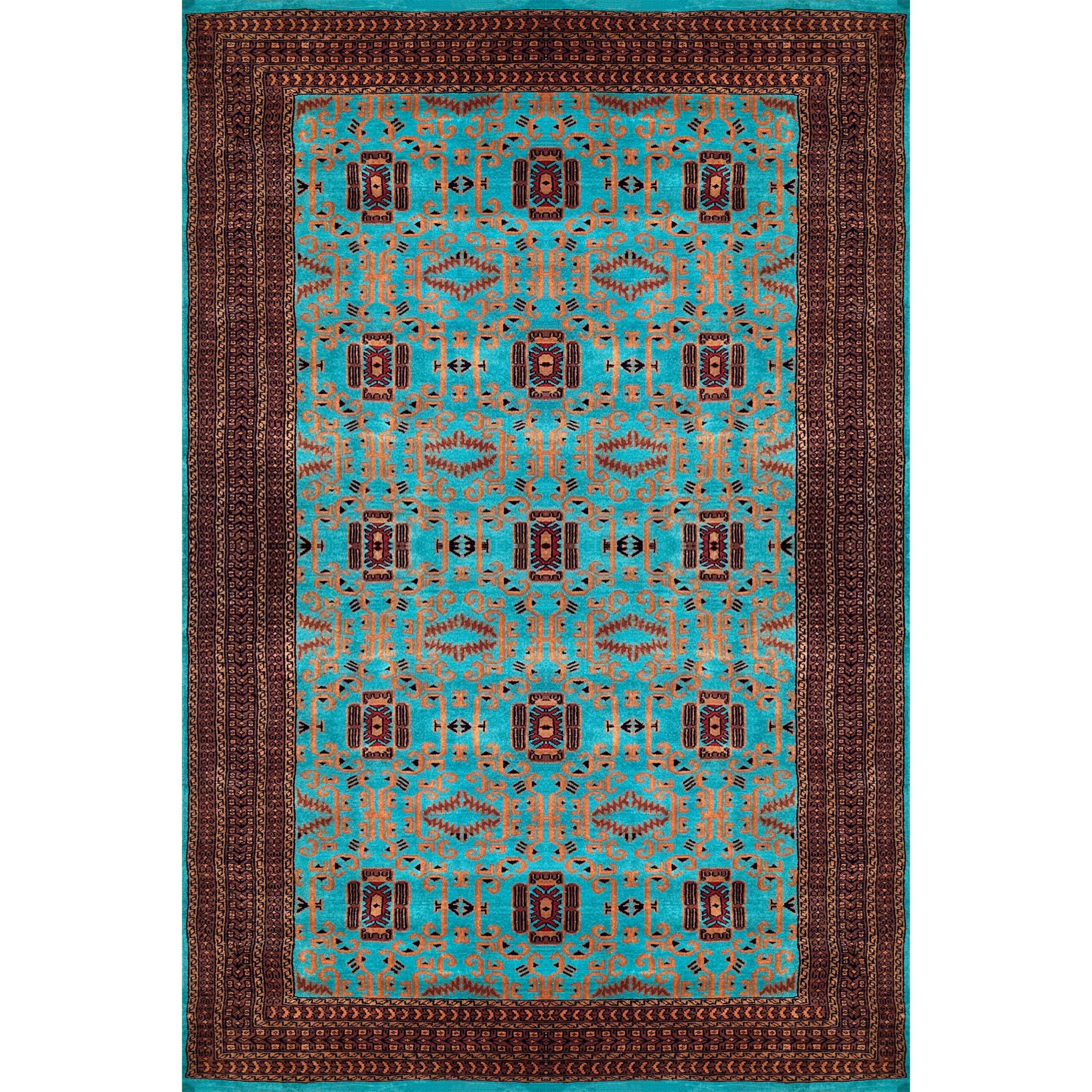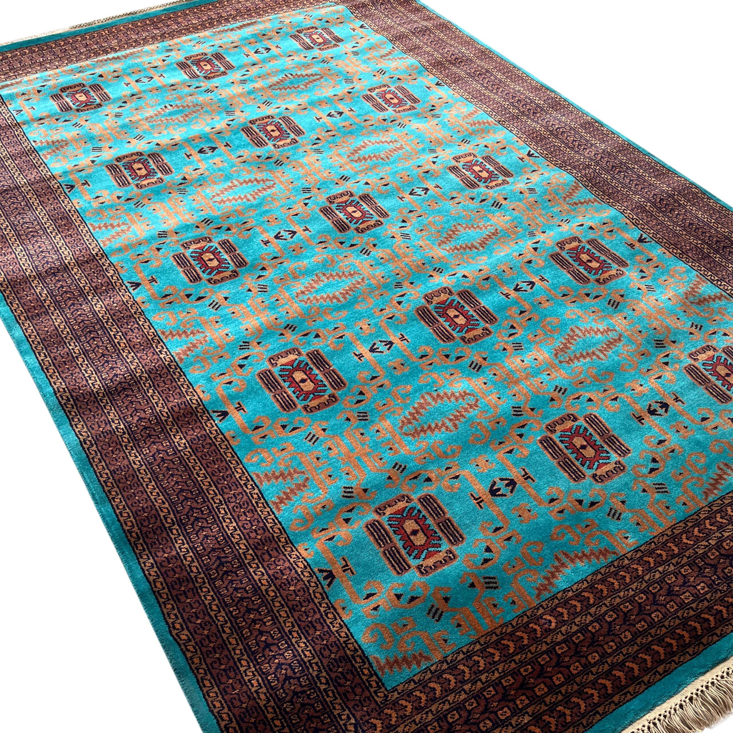 This 6×9 ft Palace design handmade carpet is crafted with premium wool and features royal motifs highlighted in a beautiful turquoise shade. Ideal for large living rooms, villas, hotels, and luxury interiors. Durable, elegant, and made by expert artisans.
